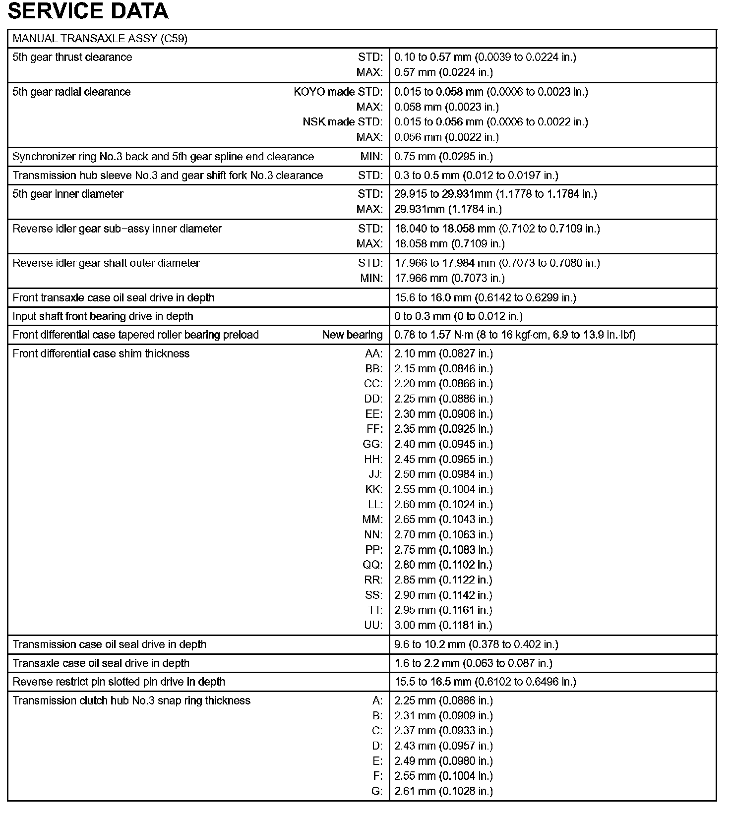 Manual Transmission / Transaxle-Service Data (Part 1):
