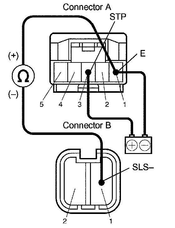 c. Connect STP terminal to the batteries' positive (+) terminal, and E terminal to the battery negative (-) terminal, and apply about 12 V between STP - E terminals.