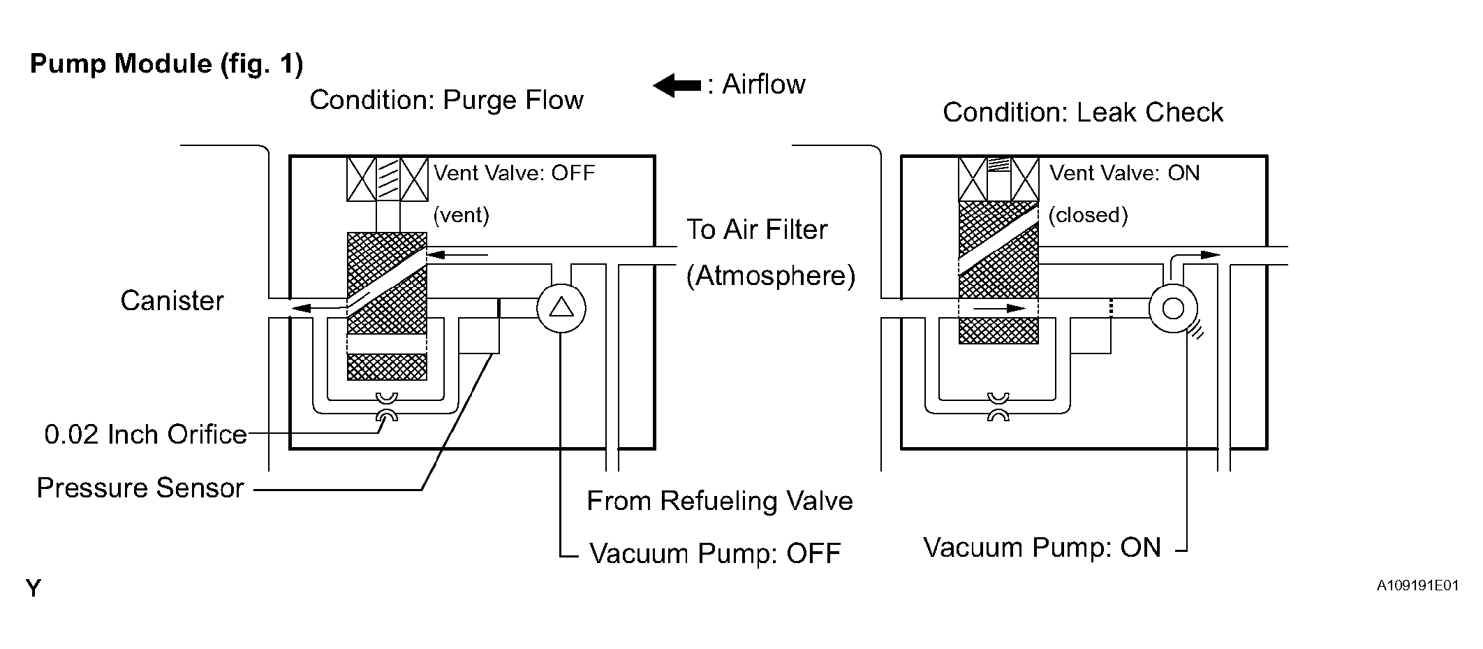 The electric vacuum pump creates negative pressure (vacuum) in the EVAP system and the pressure is measured. Finally, the ECM monitors for leaks from the EVAP system and malfunctions in both the pump module and purge VSV, based on the EVAP pressure.