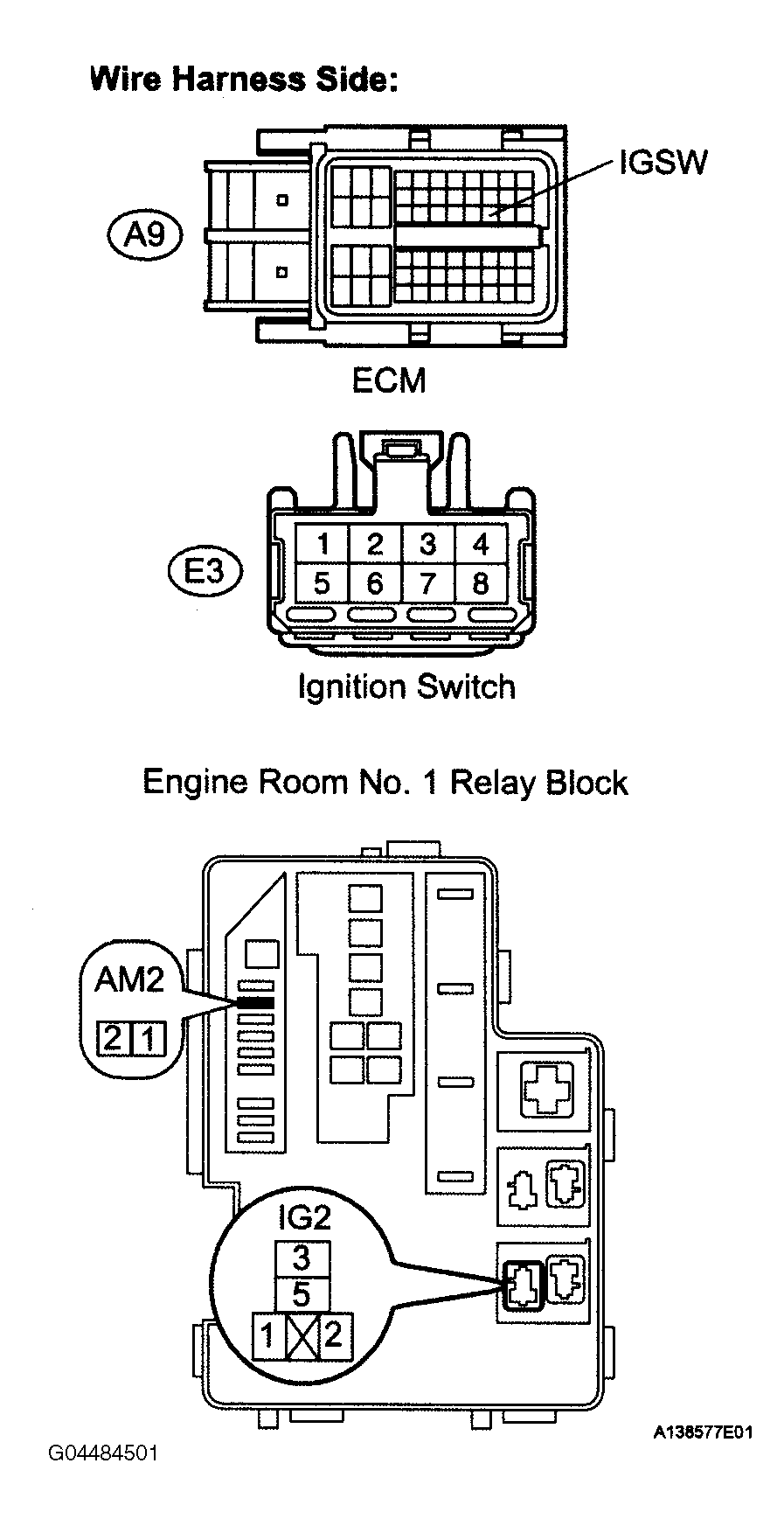CONNECTOR TERMINALS RESISTANCE REFERENCE AND CONDITIONTester Connection Specified Condition A9-28 (IGSW) - IG2 relay terminal 5 Below 1 Ω IG2 relay terminal 2 - Body ground Below 1 Ω Positive (+) battery cable - IG2 relay terminal 3 Below 1 Ω Positive (+) battery cable - AM2 fuse terminal 1 Below 1 Ω E3-7 (AM2) - AM2 fuse terminal 2 Below 1 Ω E3-6 (IG2) - IG2 relay terminal 1 Below 1 Ω A9-28 (IGSW) or IG2 relay terminal 5 - Body ground 10 kΩ or higher Positive (+) battery cable or AM2 fuse terminal 1 - Body ground 10 kΩ or higher Positive (+) battery cable or IG2 relay terminal 3 - Body ground 10 kΩ or higher E3-7 (AM2) or AM2 fuse terminal 2 - Body ground 10 kΩ or higher E3-6 (IG2) or IG2 relay terminal 1 - Body ground 10 kΩ or higher - Reinstall the relay and fuse.