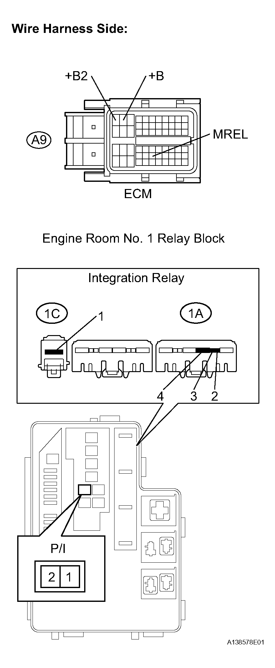 CONNECTOR TERMINALS RESISTANCE REFERENCETester Connection Specified Condition A9-2 (+B) - 1A-4 Below 1 Ω A9-1 (+B2) - 1A-4 Below 1 Ω A9-44 (MREL) - 1A-2 Below 1 Ω P/I fuse terminal 2 - 1C-1 Below 1 Ω P/I fuse terminal 1 - Positive (+) battery cable Below 1 Ω 1A-3 - Body ground Below 1 Ω A9-2 (+B) or 1A-4 - Body ground 10 kΩ or higher A9-1 (+B2) or 1A-4 - Body ground 10 kΩ or higher A9-44 (MREL) or 1A-2 - Body ground 10 kΩ or higher P/I fuse terminal 2 or 1C-1 - Body ground 10 kΩ or higher P/I fuse terminal 1 or Positive (+) battery cable - Body ground 10 kΩ or higher - Reconnect the connectors.