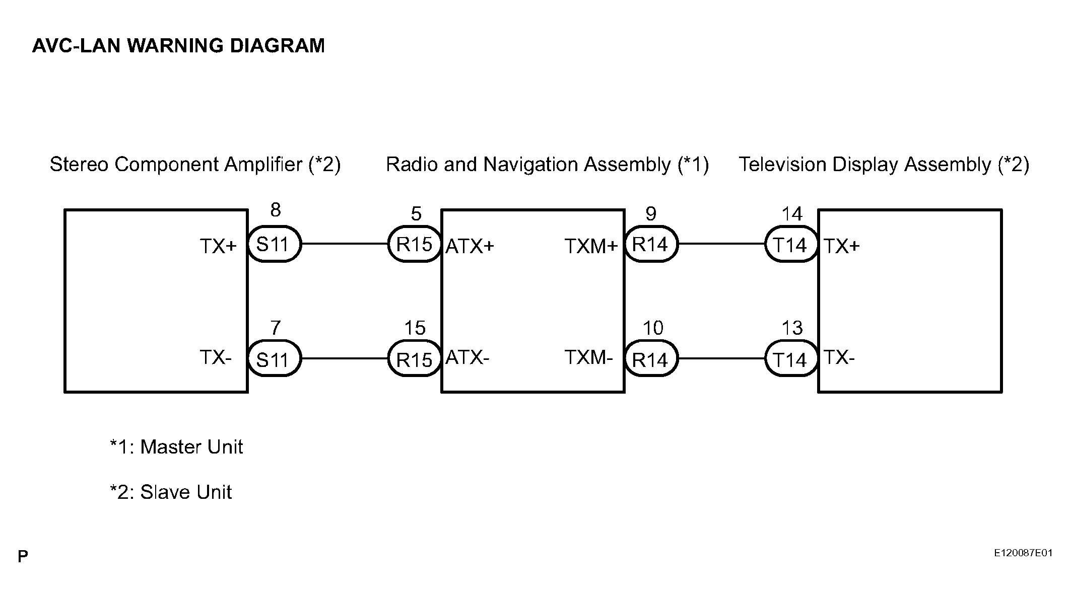 - Referring to the AVC-LAN wiring diagram below in Fig 3, check the AVC-LAN circuit between the radio and navigation assembly and the component shown by the sub-code.