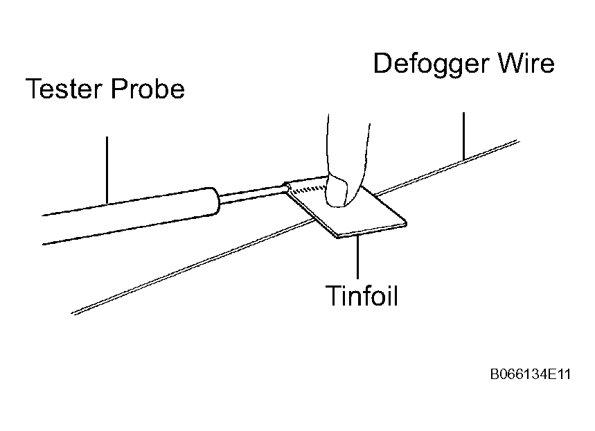 If the defogger wire is not broken, the voltmeter indicates 0 V at the positive (+) end of the defogger wire but gradually increases to about 12 V as the meter probe moves to the other end.