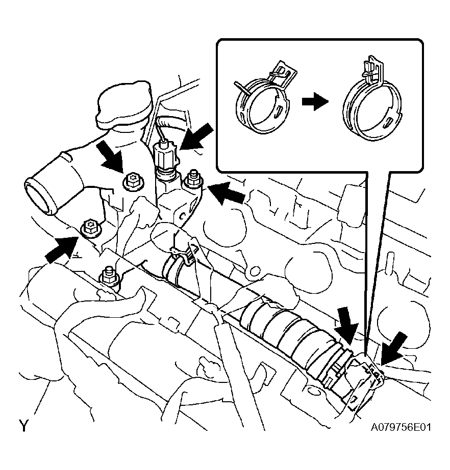 - Lock the hose clamp as shown in Fig 6 and remove the water outlet together with the No. 1 water by-pass hose.