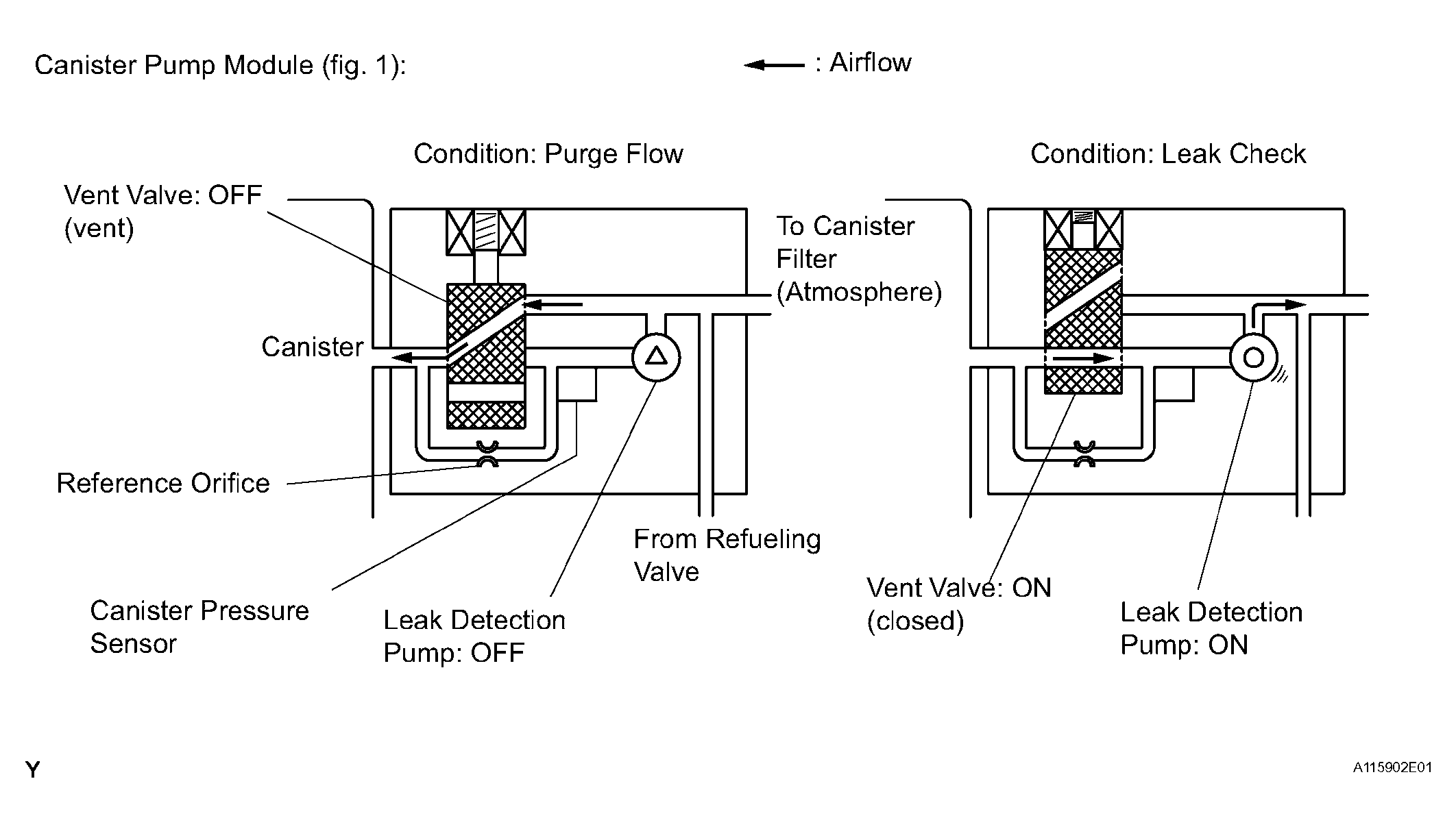 | (a) Vent valve | Vents and closes EVAP system. When ECM turns valve ON, EVAP system closed. When, ECM turns valve OFF, EVAP system vented. Negative pressure (vacuum) created in EVAP system to check for EVAP leaks by closing purge VSV, turning on vent valve (closed) and operating leak detection pump (refer to Fig 4). |