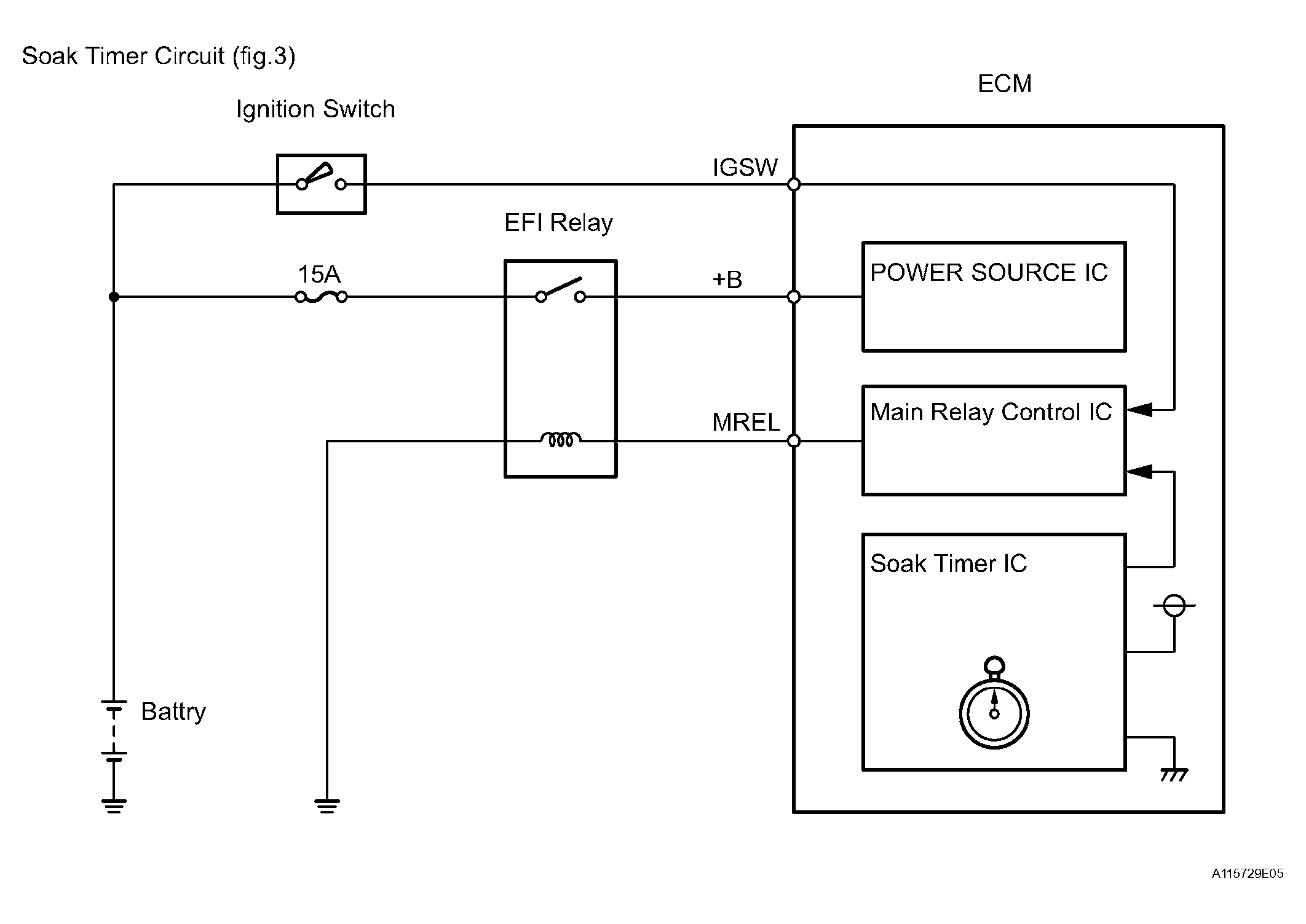 | Soak timer | Built into ECM. To ensure accurate EVAP monitor, measures 5 hours (+-15 min) after ignition switch turned OFF. This allows fuel to cool down, stabilizing fuel tank pressure. When approx 5 hours elapsed, ECM activates (refer to Fig 6). |