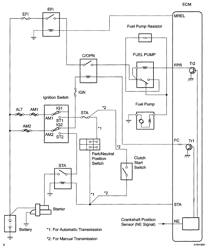 As shown in Fig 1, when the engine is cranked, current flows train terminal ST1 of the ignition switch into the ECM and the ST (starter) relay coil and also current flows to terminal STA of the ECM (STA signal).
