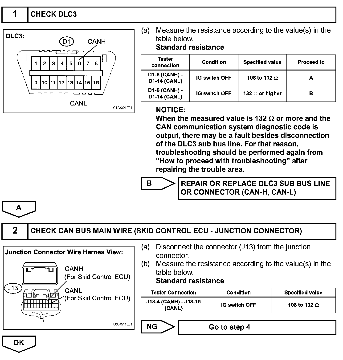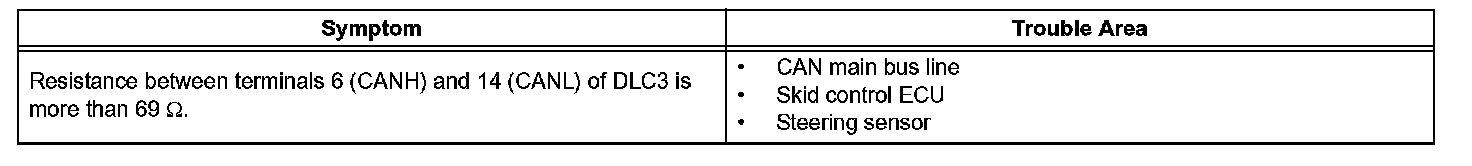 The CAN main bus line and DLC3 sub bus line may have a disconnection when the resistance between terminals 6 (CANH) and 14 (CANL) of the DLC3 is more than 69 ohms.