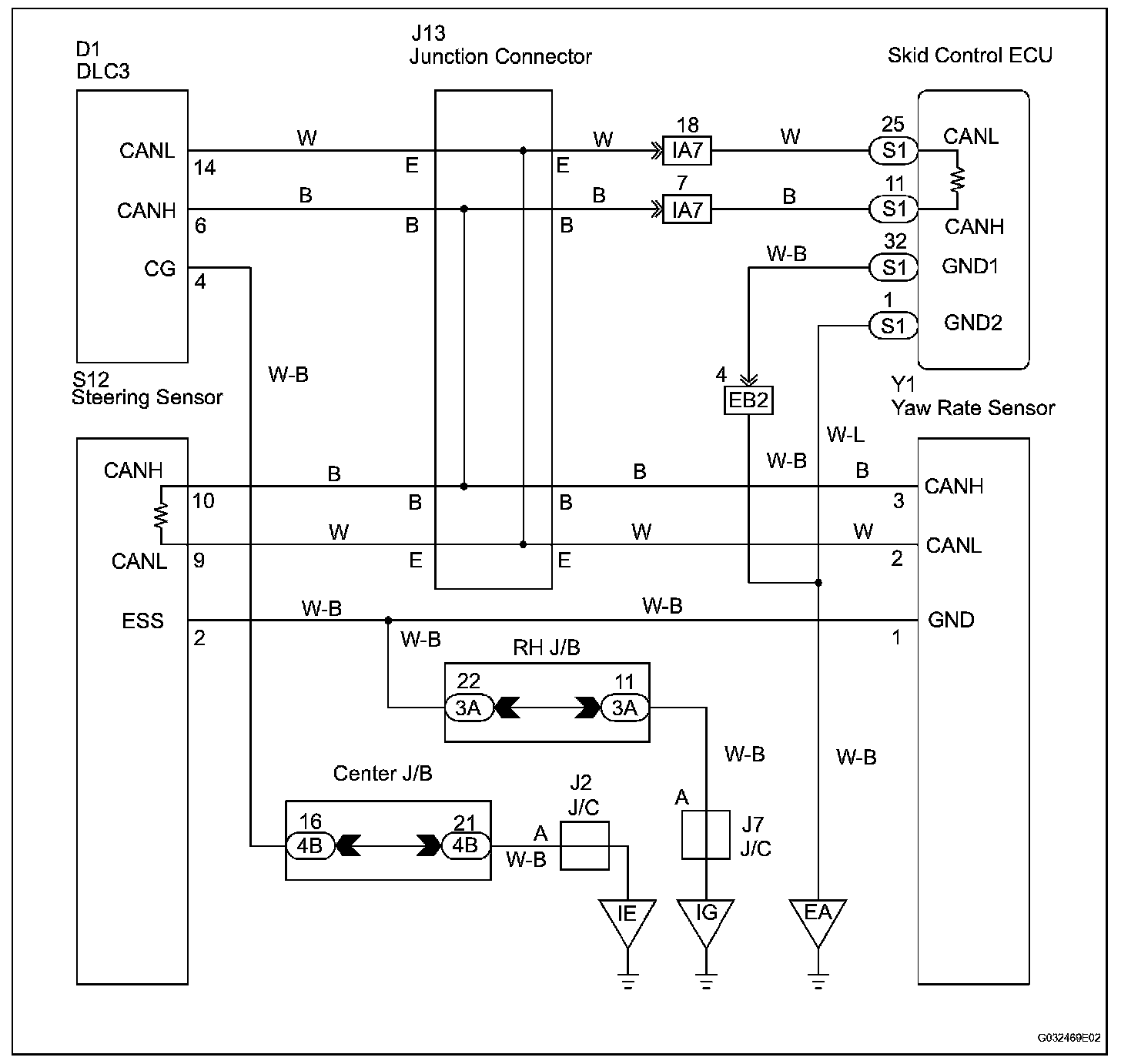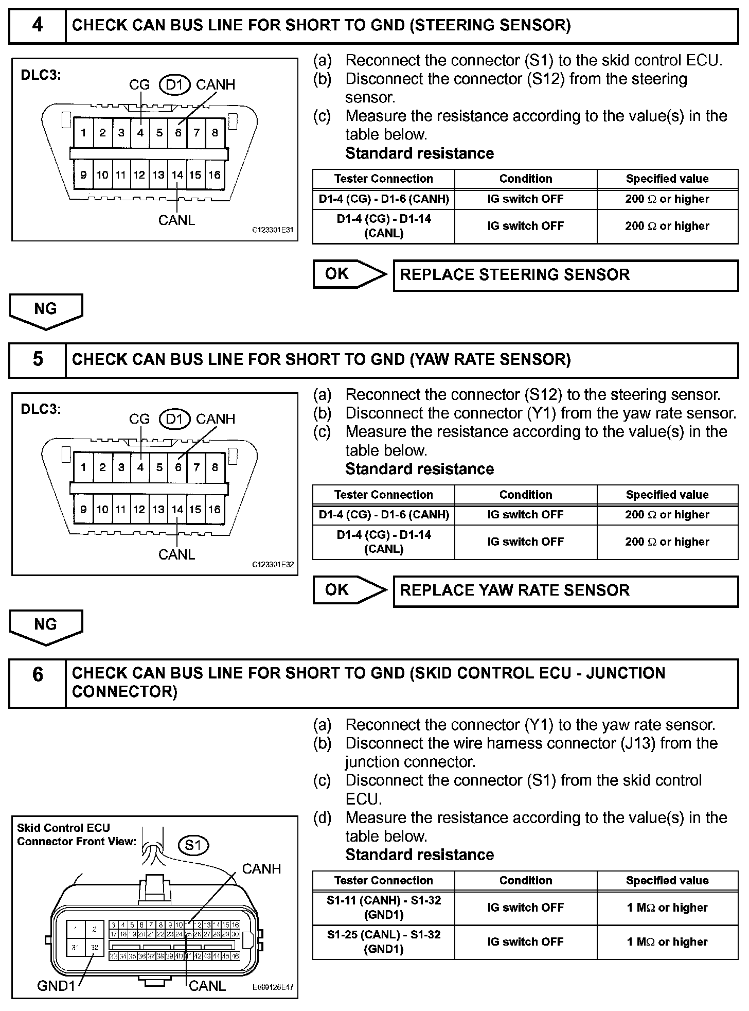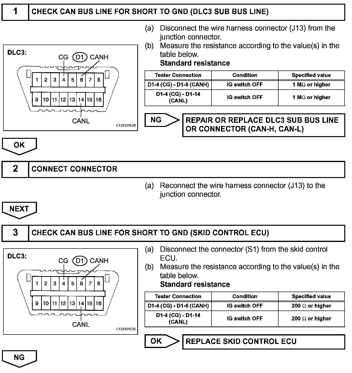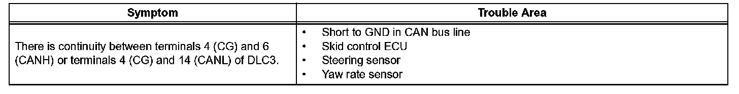 A short to GND is suspected in the CAN bus line when there is continuity between terminals 4 (CG) and 6 (CANH) or terminals 4 (CG) and 14 (CANL) of the DLC3.