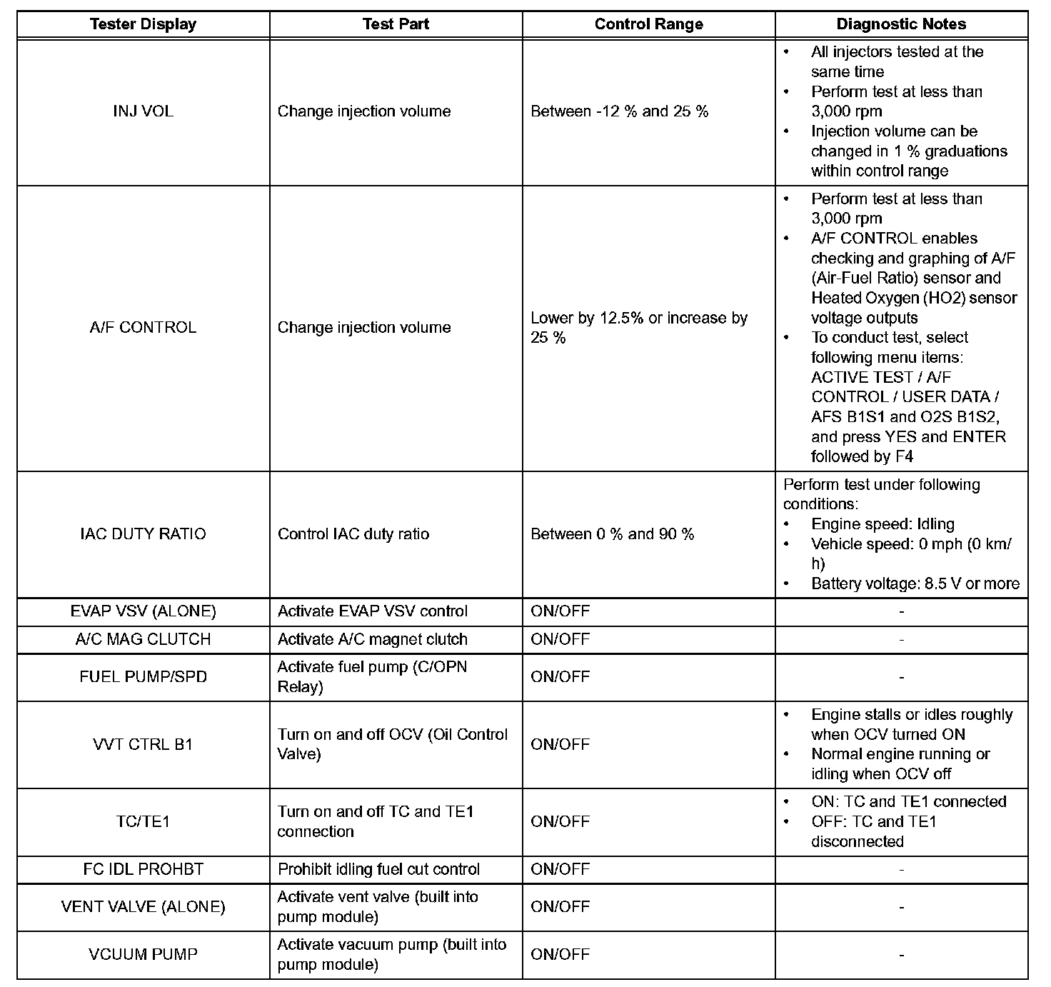 e. Perform the ACTIVE TEST by referring to the table given.