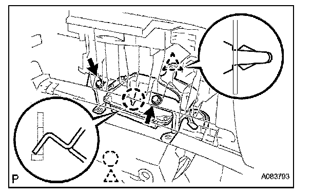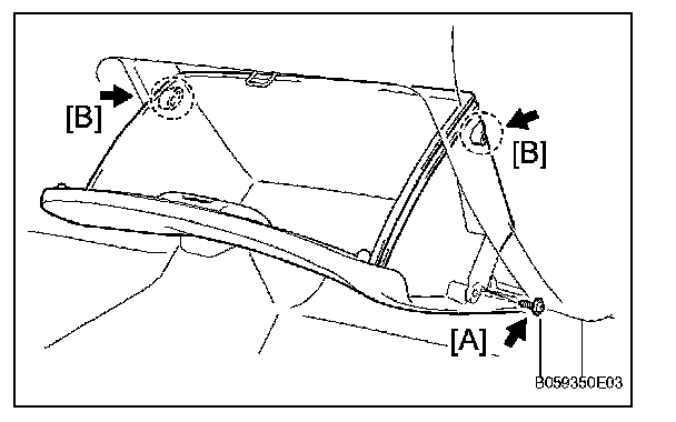 b. Deform the upper part of the glove compartment door assembly to release the stoppers [B].