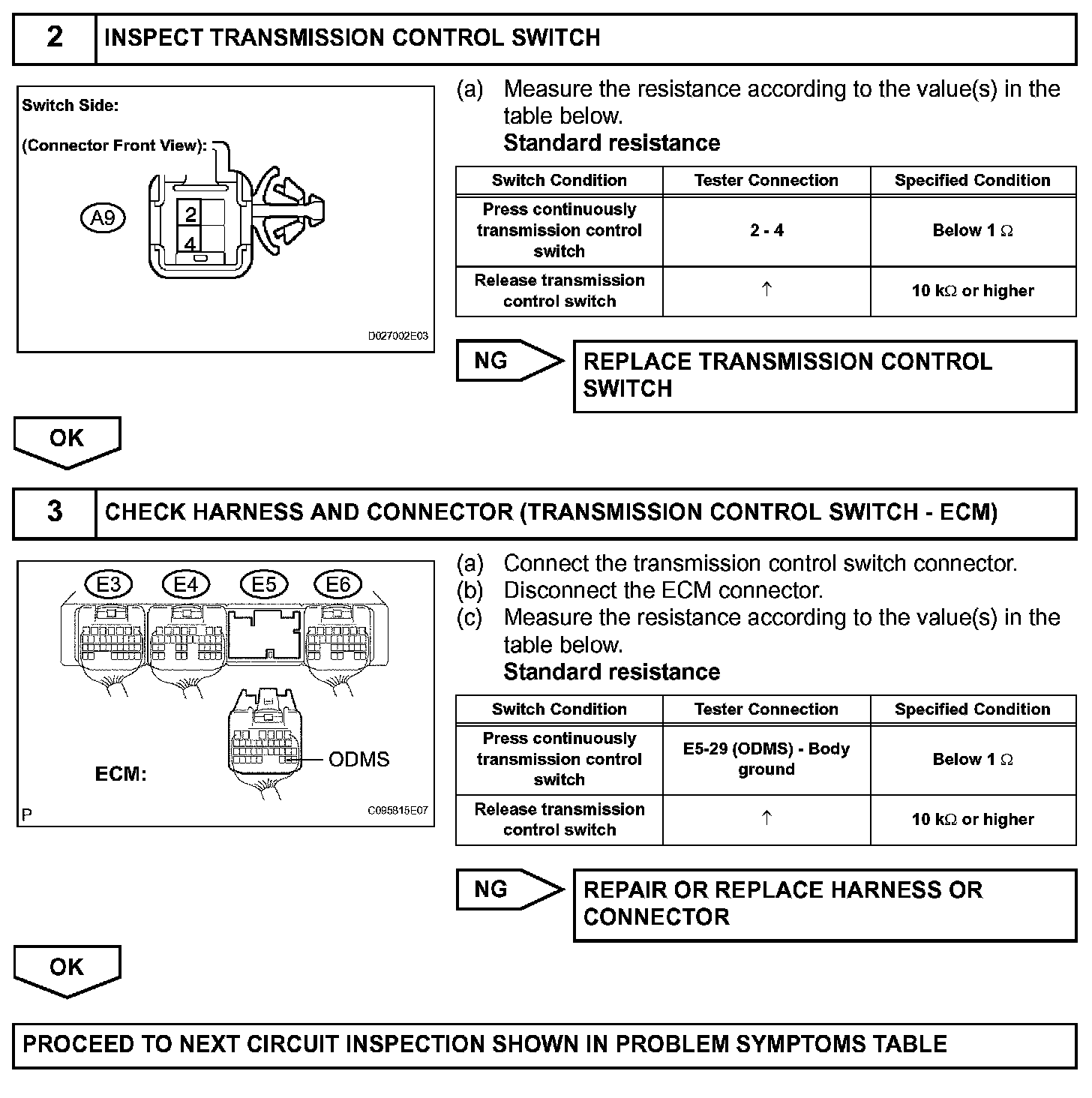 The O/D main switch (transmission control switch) is a momentary type switch. When pressing the O/D main switch, the O/D OFF indicator light lights up and the ECM prohibits shifting into O/D, and when pressing it once again, the O/D OFF indicator light goes off and the ECM allows shifting into O/D. Turning the IG switch OFF will reset the O/D OFF indicator light.