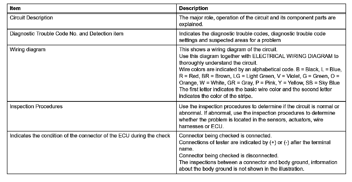 A description of the main areas of each circuit inspection is shown in the table.