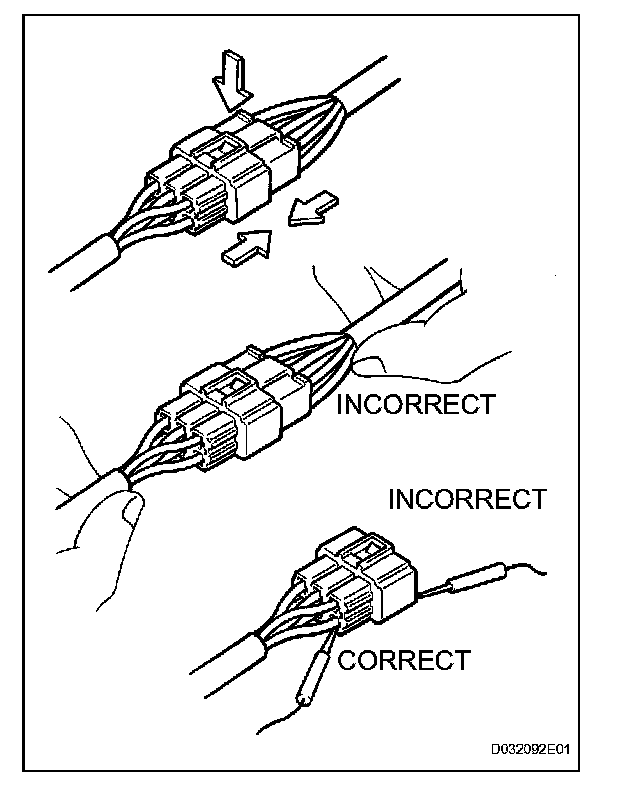 1. When disconnecting a connector, first squeeze the mating connector housing halves tightly together to release the lock, and then press the lock claw and separate the connector.