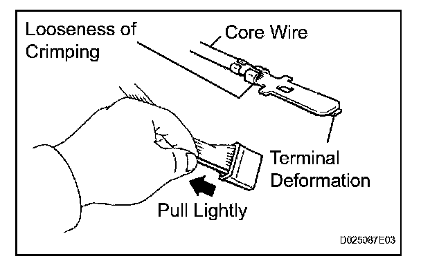 2. Checking when a connector is disconnected: Check by pulling the wire harness lightly from the backside of the connector. Look for unlatched terminals, missing terminals, loose crimps or broken conductor wires. Check visually for corrosion, metallic or foreign matter and water, and bent, rusted, overheated, contaminated, or deformed terminals.