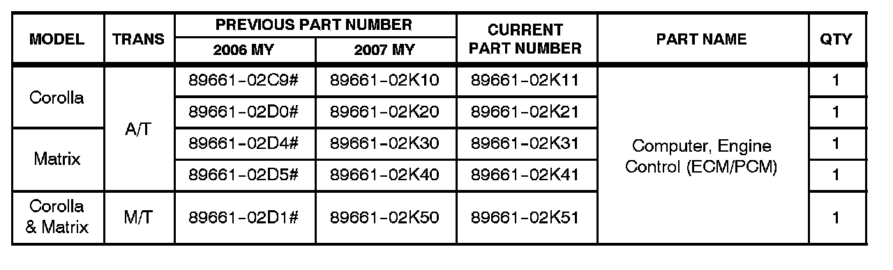 ^ 2006 - 2007 model year Corolla and Matrix (2WD) vehicles equipped with the 1ZZ-FE engine and produced BEFORE the Production Change Effective VINs shown below.