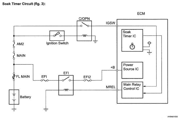 Soak timer Built into ECM. To ensure accurate EVAP monitor, measures 5 hours (+-15 min) after ignition switch turned to OFF. This allows fuel to cool down, stabilizing EVAP pressure. When approximately 5 hours elapsed, ECM activates (refer to Fig 6).
