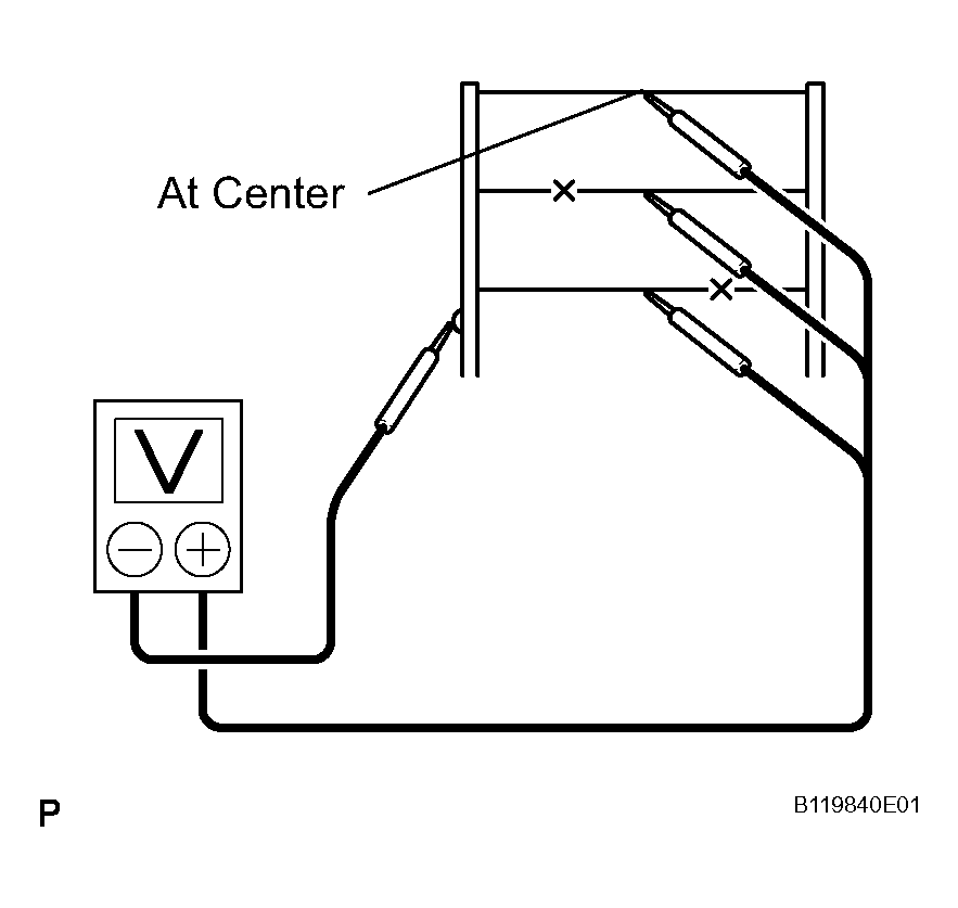 If there is approximately 10 V, the wire may be faulty between the center of the wire and the wire end on the battery side. If there is no voltage, the wire may be faulty between the center of the wire end and the wire end on the ground side.