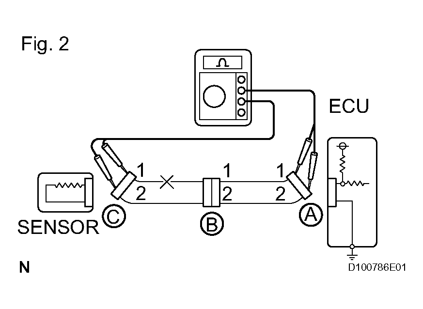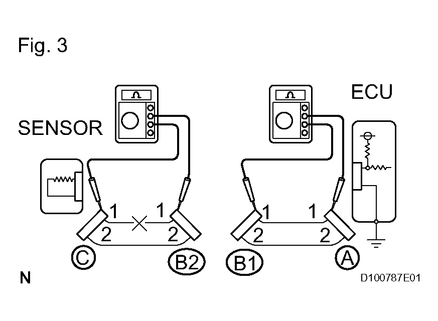 Measure the resistance while lightly shaking the wire harness vertically and horizontally. If the results match the examples above, an open circuit exists between terminal 1 of connector A and terminal 1 of connector C.