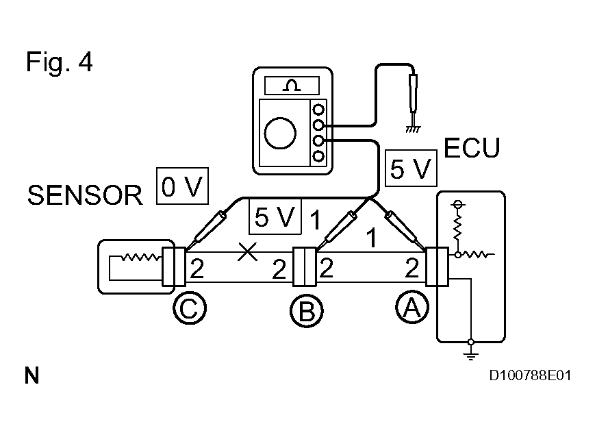 STANDARD VOLTAGE REFERENCE CHARTTester Connection Specified Condition Connector A terminal 1 - Body ground 5 V Connector B terminal 1 - Body ground 5 V Connector C terminal 1 - Body ground Below 1 V If the results match the examples above, an open circuit exists in the wire harness between terminal 1 of connector B and terminal 1 of connector C.