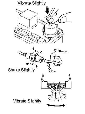 With a problem that only occurs when the engine is cold or as a result of vibration caused by the road during driving, the problem can never be determined if the symptoms are being checked on a stationary vehicle or a vehicle with a warmed-up engine. Vibration, heat or water penetration (moisture) is difficult to reproduce. The symptom simulation tests below are effective substitutes for the conditions and can be applied on a stationary vehicle. Important points in the symptom simulation test: