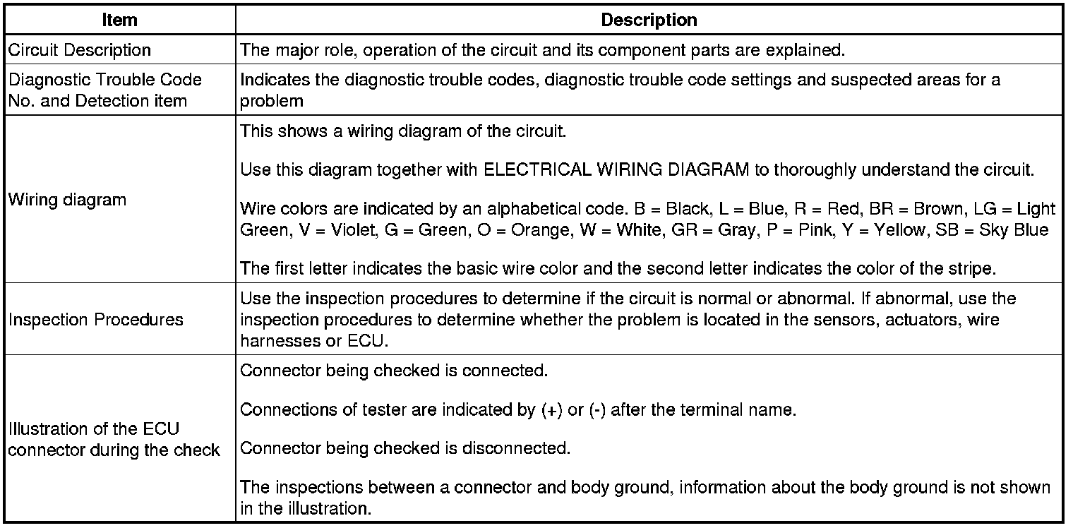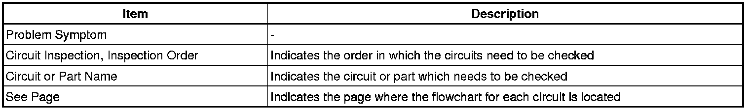 When a "Normal" code is output during a DTC check but the problem still occurs, use the Problem Symptoms Table. The suspected areas (circuits or parts) for each problem symptoms are in the table. The suspected areas are listed in order of probability. A description of each of the chart's columns is shown in the table below.