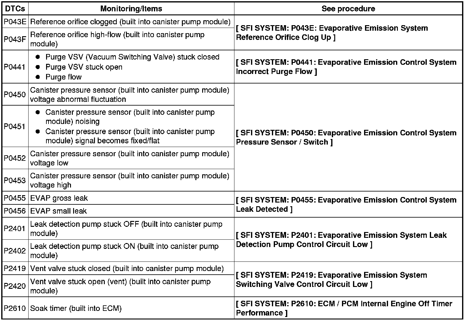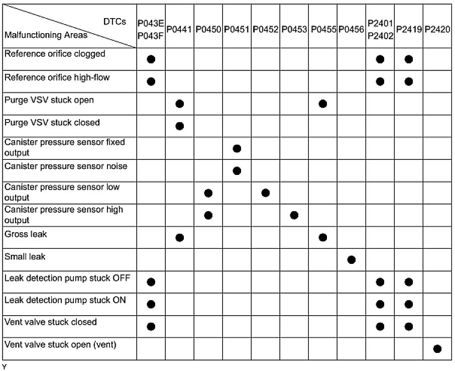 If any EVAP system DTCs are set, the malfunctioning area can be determined using the table below.