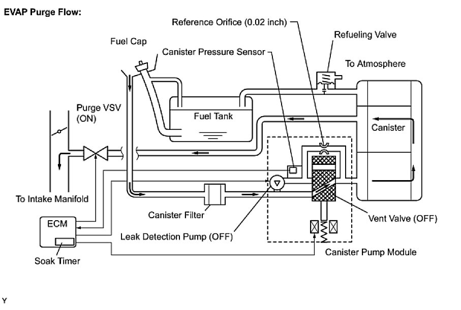 While the engine is running, if a predetermined condition (closed- loop, etc.) is met, the purge VSV is opened by the ECM and stored fuel vapors in the canister are purged to the intake manifold. The ECM changes the duty cycle ratio of the purge VSV to control purge flow volume.