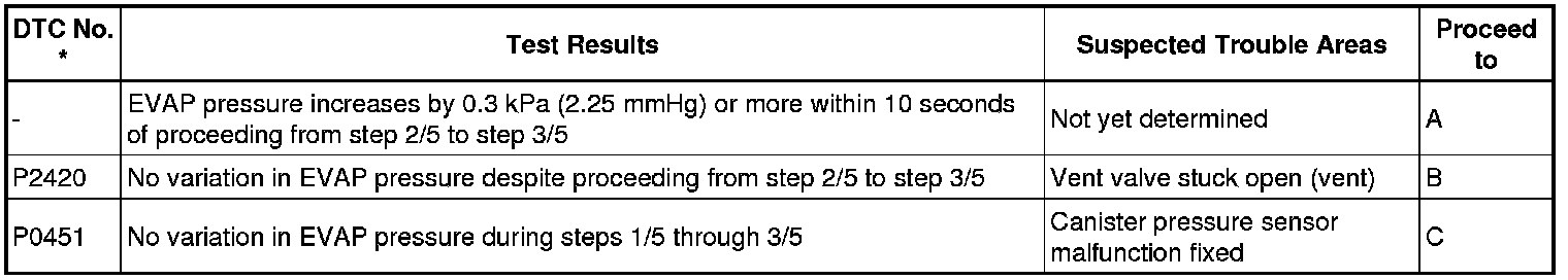 NOTE: If the reference pressure difference between the first and second checks is greater than the specification, the DTCs corresponding to the reference pressure (P043E, P043F, P0441, P0455, P0456, P2401 and P2420) will all be stored.