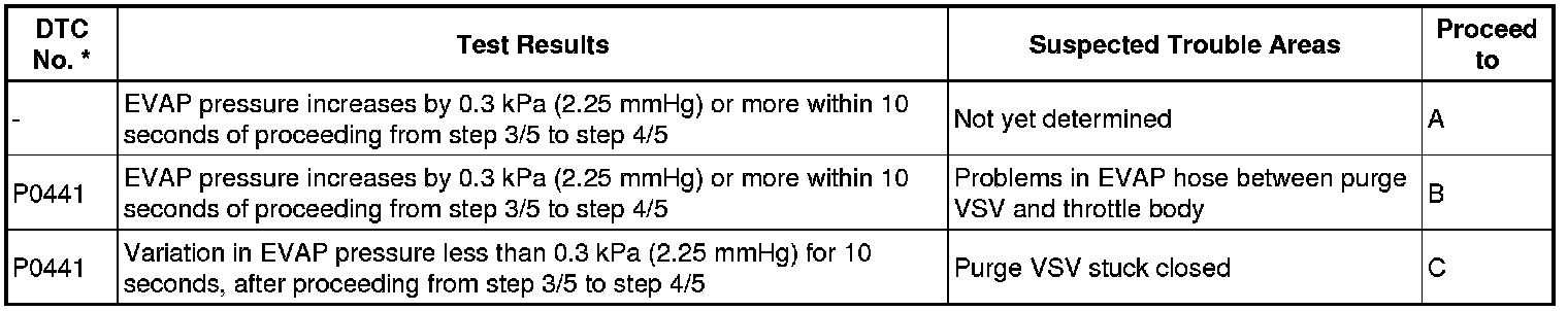 The vent valve is turned OFF (open) and the EVAP pressure is measured. If the variation in the pressure is less than 0.5 kPa-g (3.75 mmHg-g), the ECM interprets this as the purge VSV being stuck closed, and illuminates the MIL and sets DTC P0441 (2 trip detection logic).