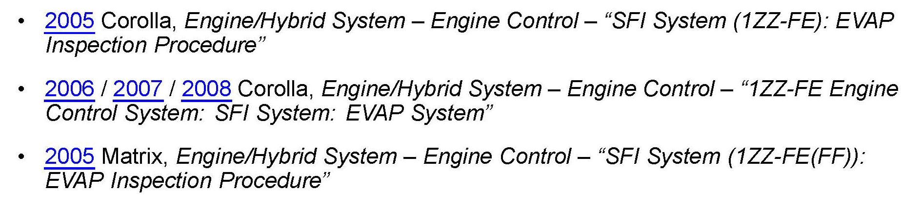 Some 2007 - 2008 model year Corolla and Matrix vehicles may exhibit a MIL "ON" condition with Diagnostic Trouble Code (DTC) P0456 - Evaporative Emission Control System Leak Detected (Very Small Leak). The Engine Control Module/ECM (SAE term: Powertrain Control Module/PCM) logic has been modified to reduce the possibility of this condition occurring. This bulletin also applies to 2005 - 2006 model year Corolla and Matrix vehicles which were previously repaired using a 2007 model year ECM. Use the following repair procedure to address this condition.