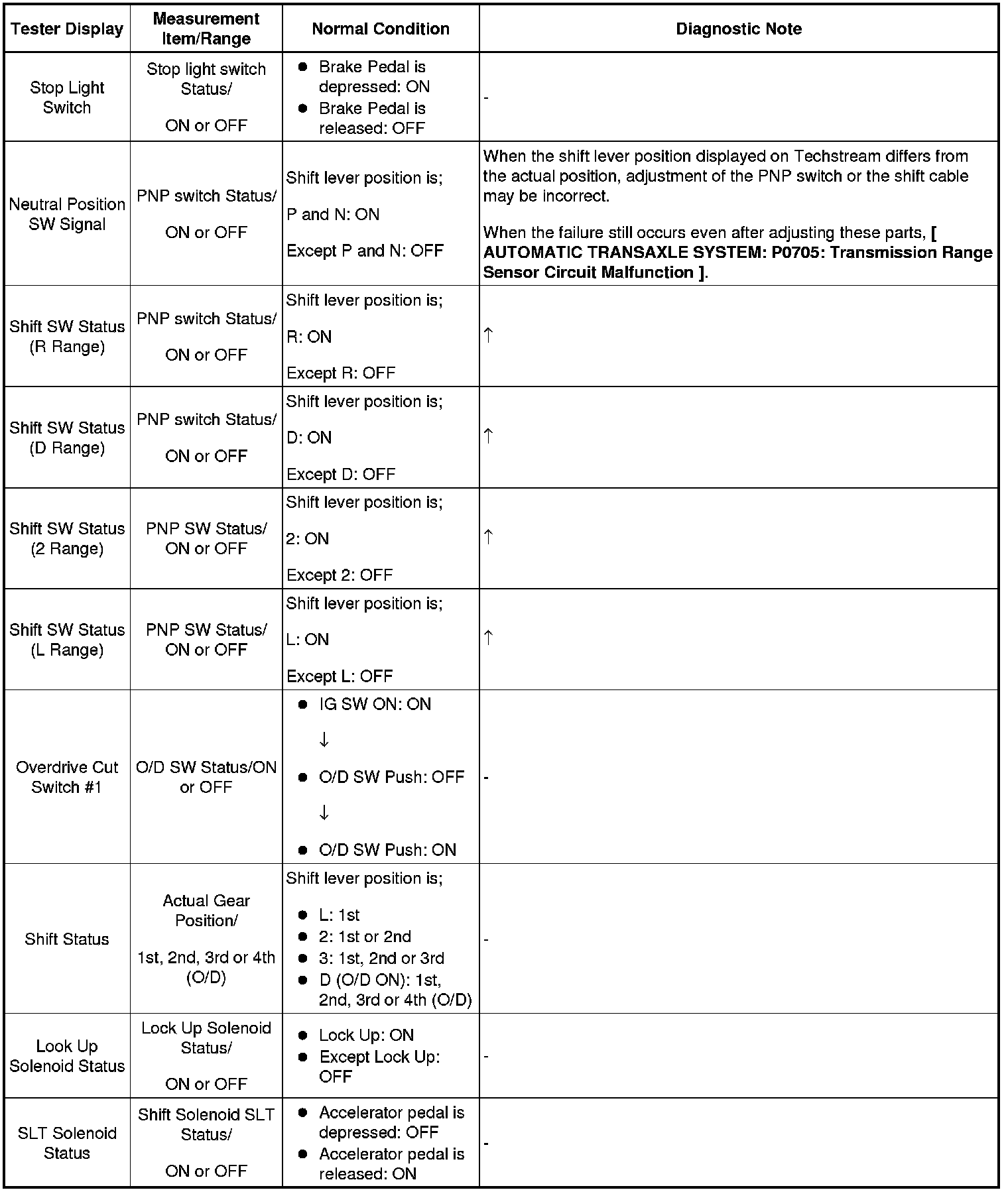 HINT: According to the Data List displayed by Techstream, you can read the value of the switch, sensor, actuator and so on without parts removal. Reading the Data List as the first step of troubleshooting is one method to shorten labor time.