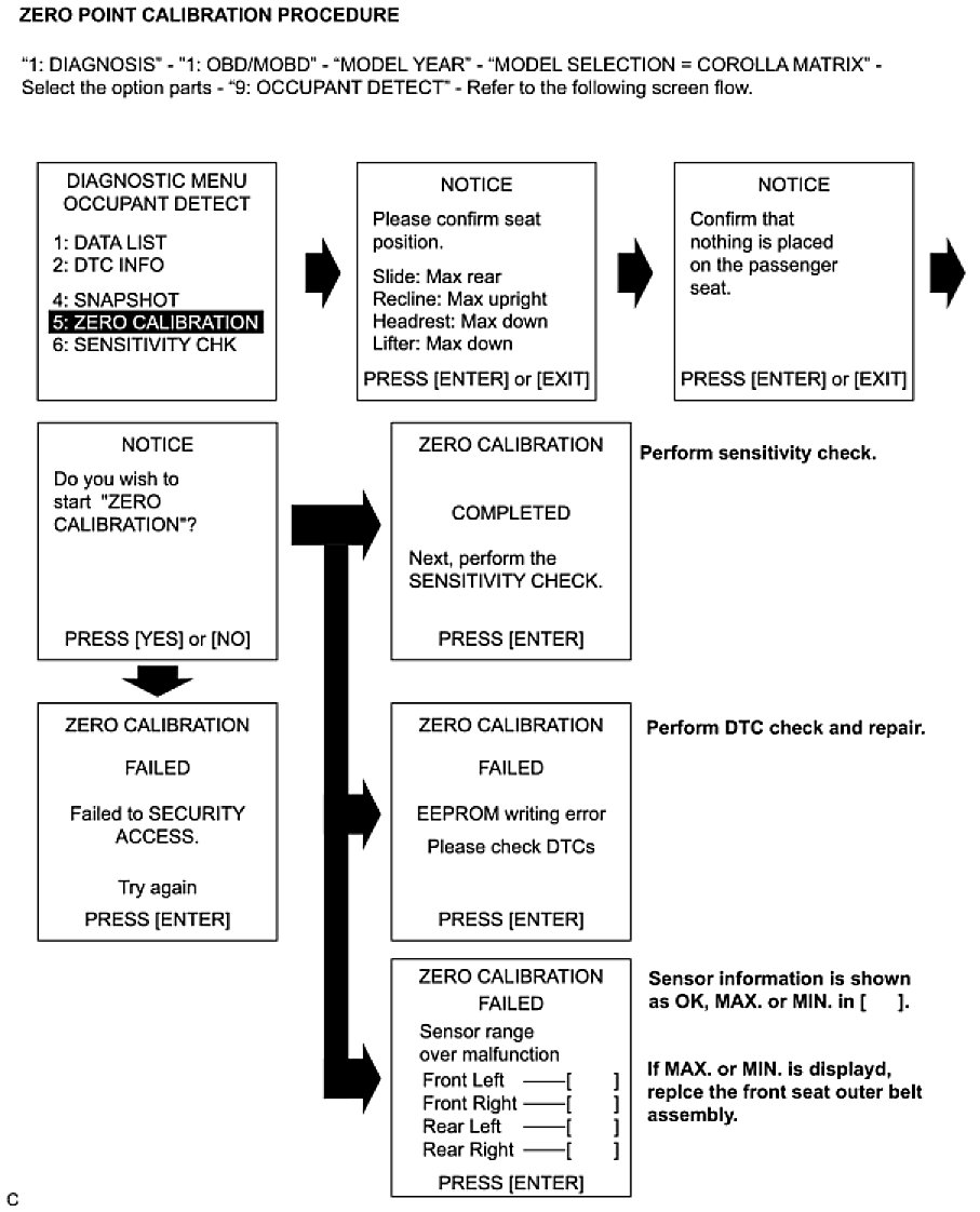 - If zero point calibration has not finished normally, replace the front seat assembly RH.