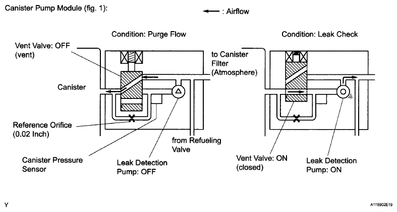 The leak detection pump creates negative pressure (vacuum) in the EVAP system and the pressure is measured. Finally, the ECM monitors for leaks from the EVAP system, and malfunctions in both the canister pump module and purge VSV, based on the EVAP pressure.