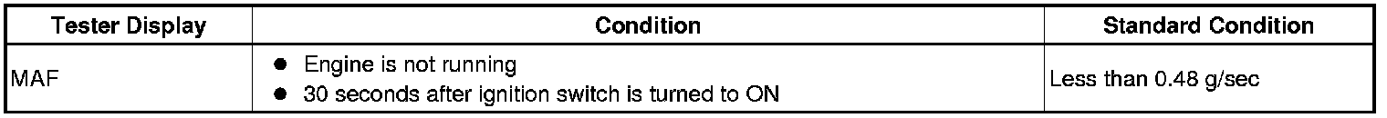 - Only replace the mass air flow meter when there is foreign matter on the MAF meter platinum hot wire, or the MAF value in the Data List (with the engine stopped) is not within the normal operating range.