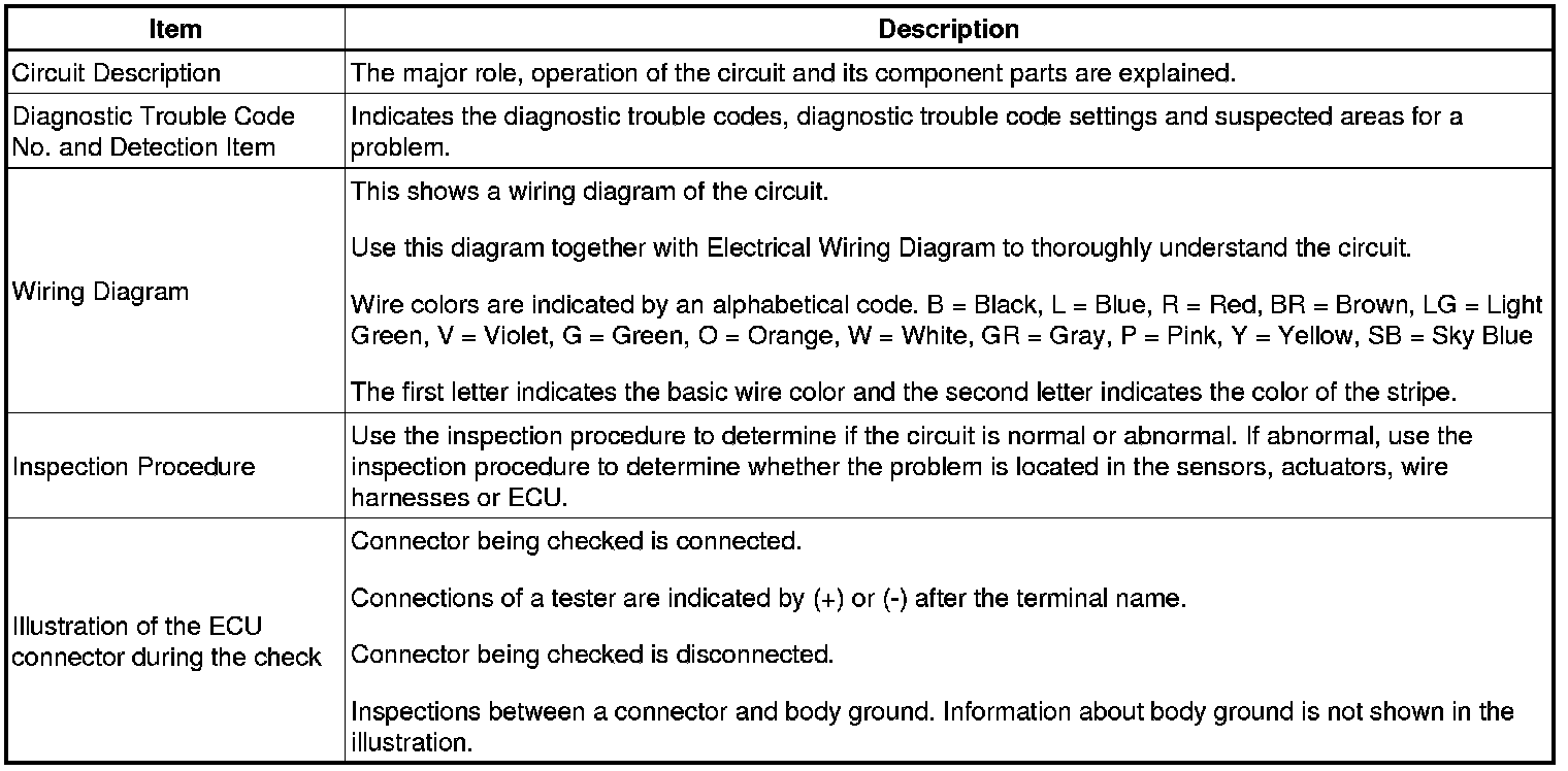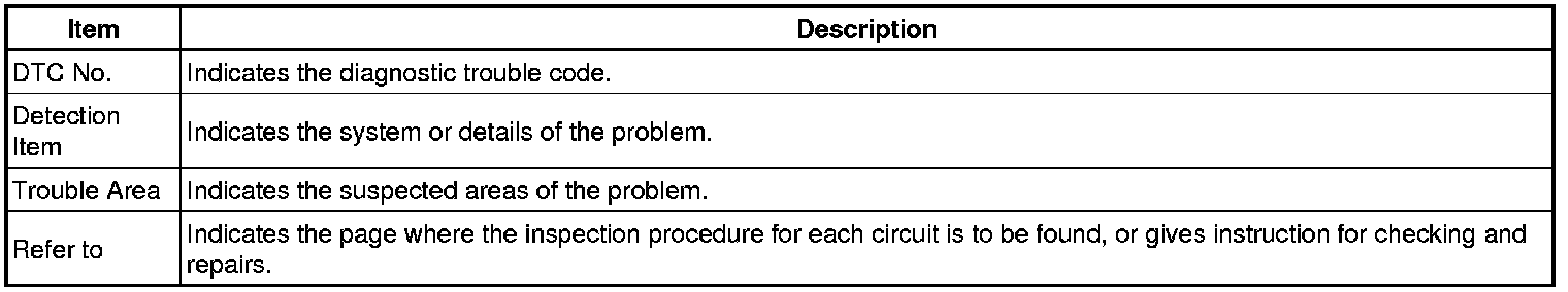 Look for output Diagnostic Trouble Codes (DTCs) (from the DTC checks) in the appropriate section's Diagnostic Trouble Code Chart. Use the chart to determine the trouble area and the proper inspection procedure. A description of each of the chart's columns is shown in the table below.