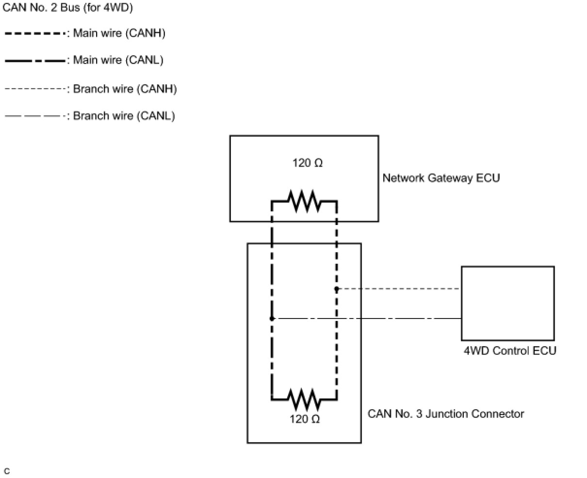 (1) Two resistors of 120 Ohms are installed in parallel across the ends of the CAN main bus wire. They are called terminating resistors. These resistors allow the changes of the voltage differential between the CAN bus wires to be accurately judged. To allow proper function of CAN communication, it is necessary to have both terminating resistors installed. Since the two resistors are installed in parallel, a measurement of resistance between the two CAN bus wires should produce a reading of approximately 60 Ohms.