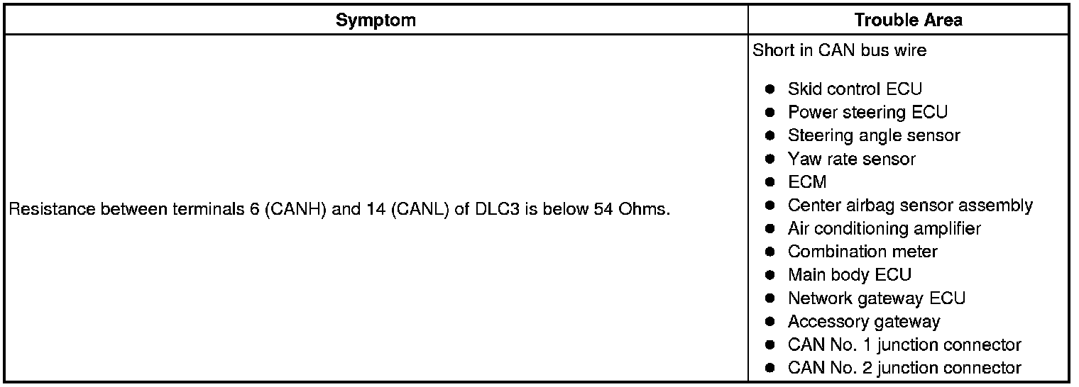 There may be a short circuit in the CAN main wire and/or CAN branch wire when the resistance between terminals 6 (CANH) and 14 (CANL) of the DLC3 is below 54 Ohms.