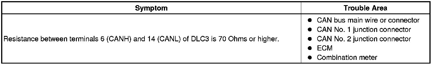 There may be an open circuit in the CAN main wire and/or the DLC3 branch wire when the resistance between terminals 6 (CANH) and 14 (CANL) of the DLC3 is 70 Ohms or higher.