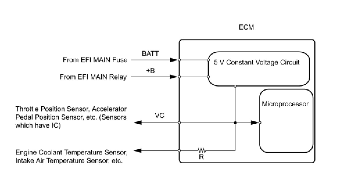 The ECM constantly generates 5 V power from the battery voltage supplied to the +B (BATT) terminal to operate the microprocessor. The ECM also provides this power to the sensors through the VC output circuit.