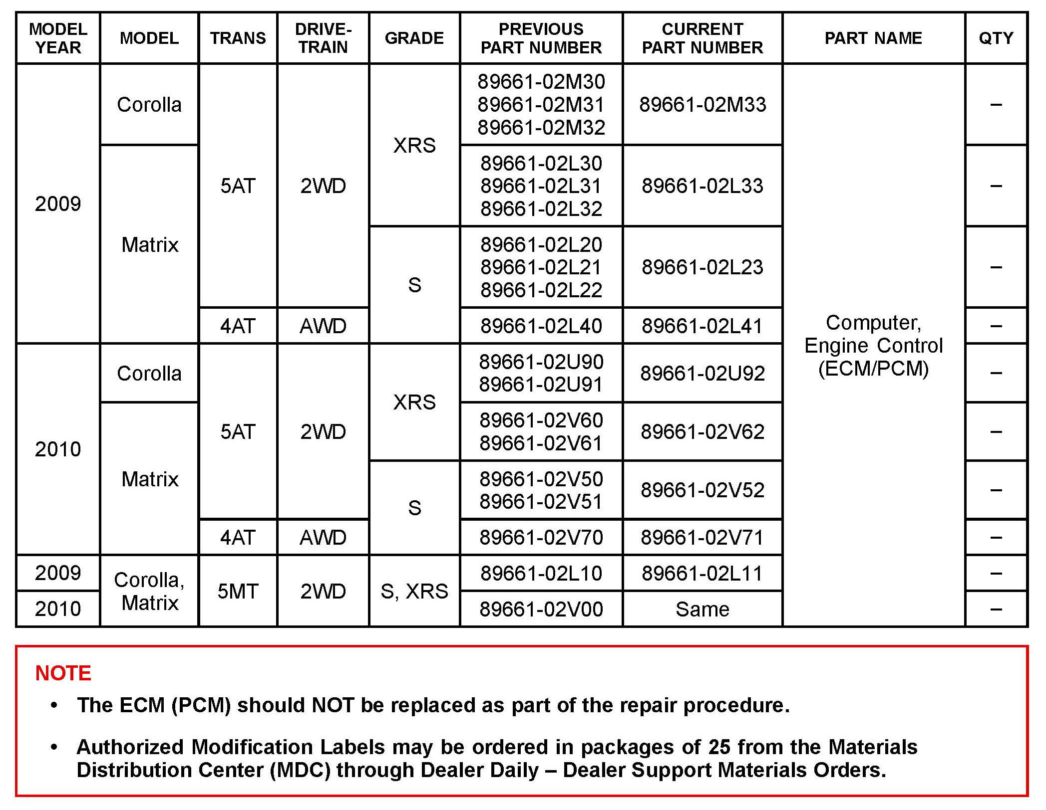 Some 2009 - 2010 model year Corolla and Matrix vehicles with a 2AZ engine may exhibit a MIL "ON" condition with Diagnostic Trouble Code (DTC) P0456 - Evaporative Emission Control System Leak Detected (Very Small Leak). The Engine Control Module/ECM (SAE term: Powertrain Control Module/PCM) logic has been modified to reduce the possibility of this condition occurring. Use the following repair procedure to address this condition.