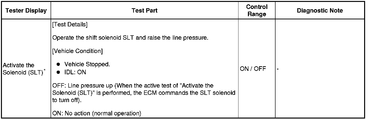 *: "Activate the Solenoid (SLT)" in the Active Test is performed to check the line pressure changes by connecting the SST to the automatic transaxle, which is used in the HYDRAULIC TEST Hydraulic Test as well.