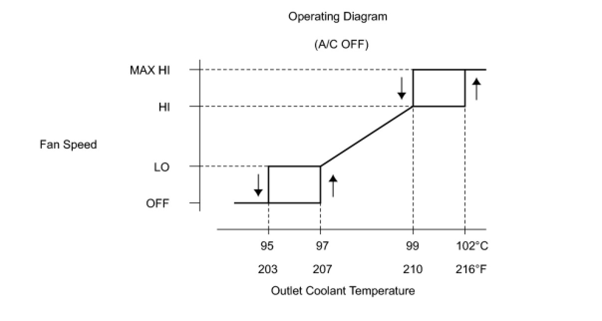 - The coolant temperature at which the fan starts operating is approximately 97°C (207°F).