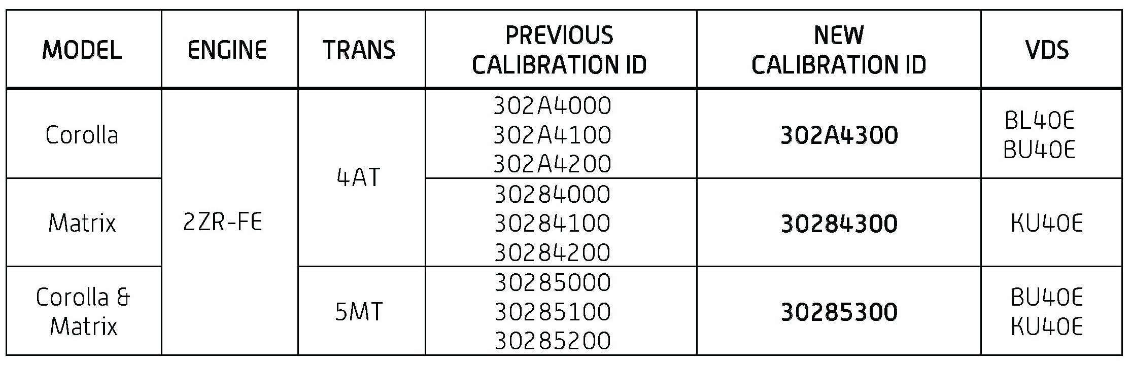 - Calibration ID(s) [Refer to the Calibration Identification Chart for the NEW CALIBRATION ID]