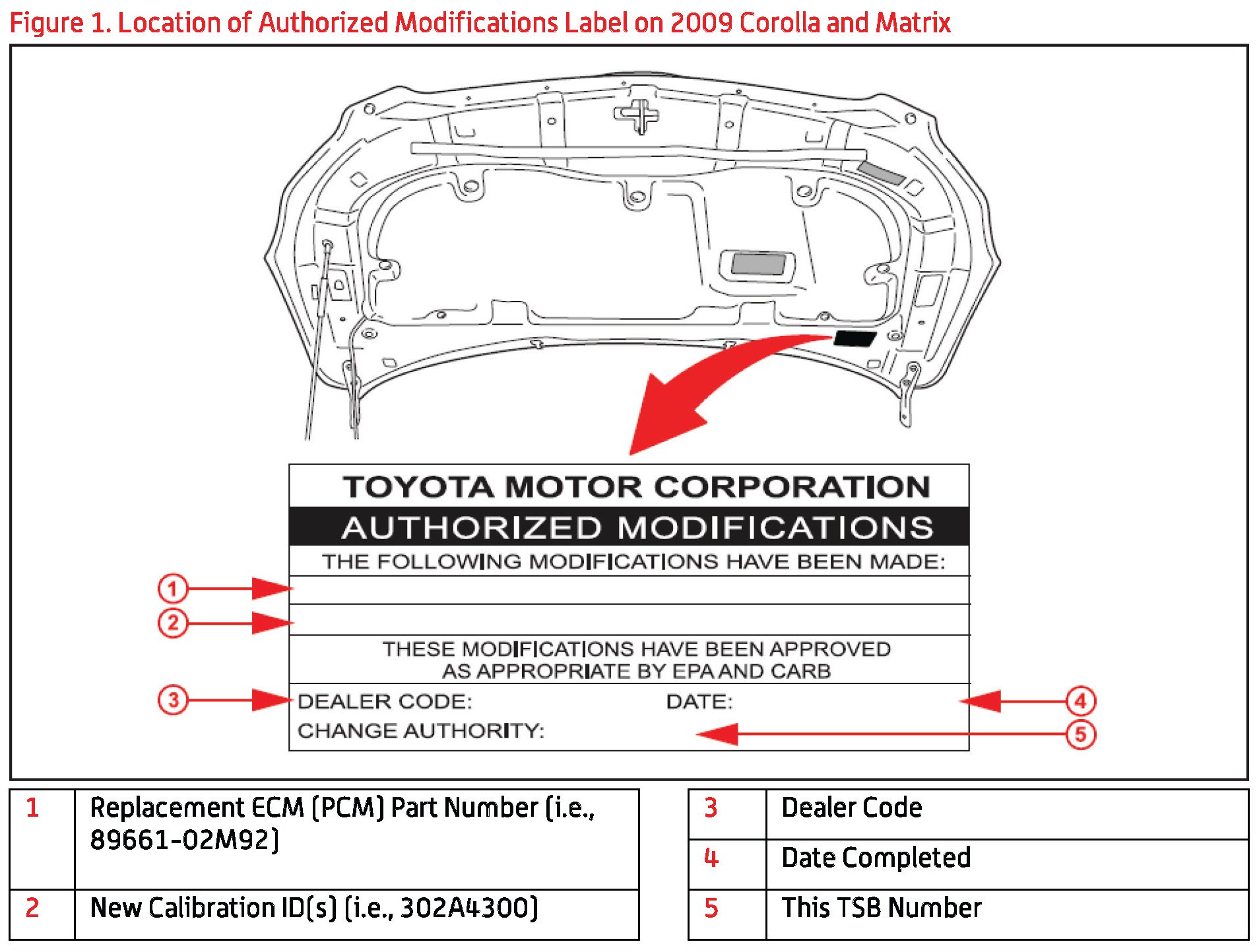 2. Check for the Authorized Modifications Label affixed to the vehicle in the location shown in Figure 1.Confirm if the ECM (PCM) calibration has been updated. If the calibration ID listed is NOT the latest ECM (PCM) calibration - go to step 3.