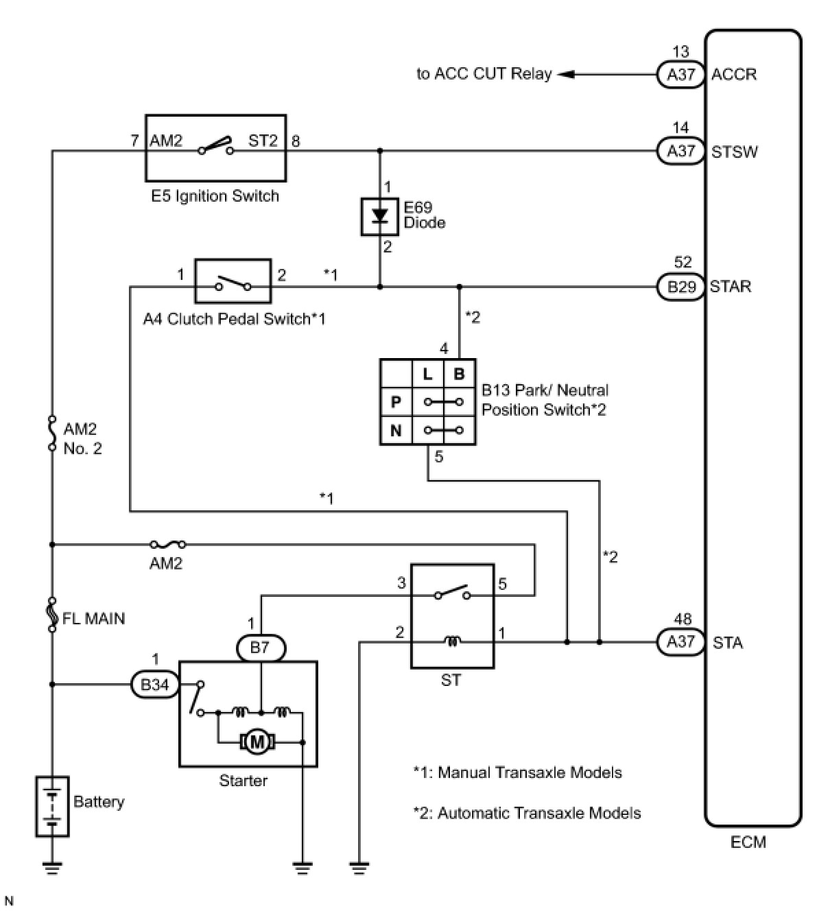 When the ECM detects the STSW signal, the ECM outputs the starter relay drive signal (STAR signal) to the starter relay through the clutch pedal switch assembly or park/neutral position switch, and then the engine is cranked. When the ECM receives a stable engine speed signal (NE signal) (more specifically, when the NE signal reaches a predetermined value), the ECM stops outputting the STAR signal. Also, the ECM monitors the ST relay operating conditions based on the STA terminal voltage status.
