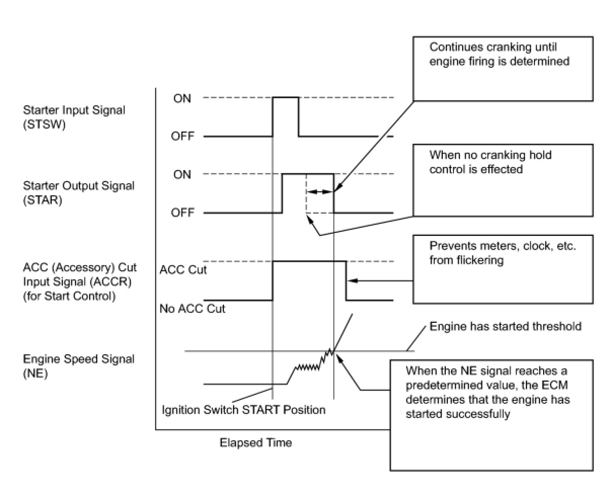 The cranking holding control system keeps energizing the ST relay after the ECM detects the starter signal (STSW signal) from the main body ECU until the ECM performs a judgment of "Engine started". Furthermore, the ECM outputs an accessory cut signal (ACCR signal) to the ACC CUT relay during cranking to prevent flickering of the combination meter, clock, audio system, and other areas.