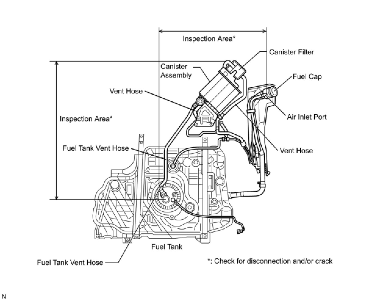 HINT: Disconnect the hose between the canister and the fuel tank from the canister. Block the canister side and conduct an inspection. In this way, the fuel tank can be excluded as an area suspected of causing fuel leaks.