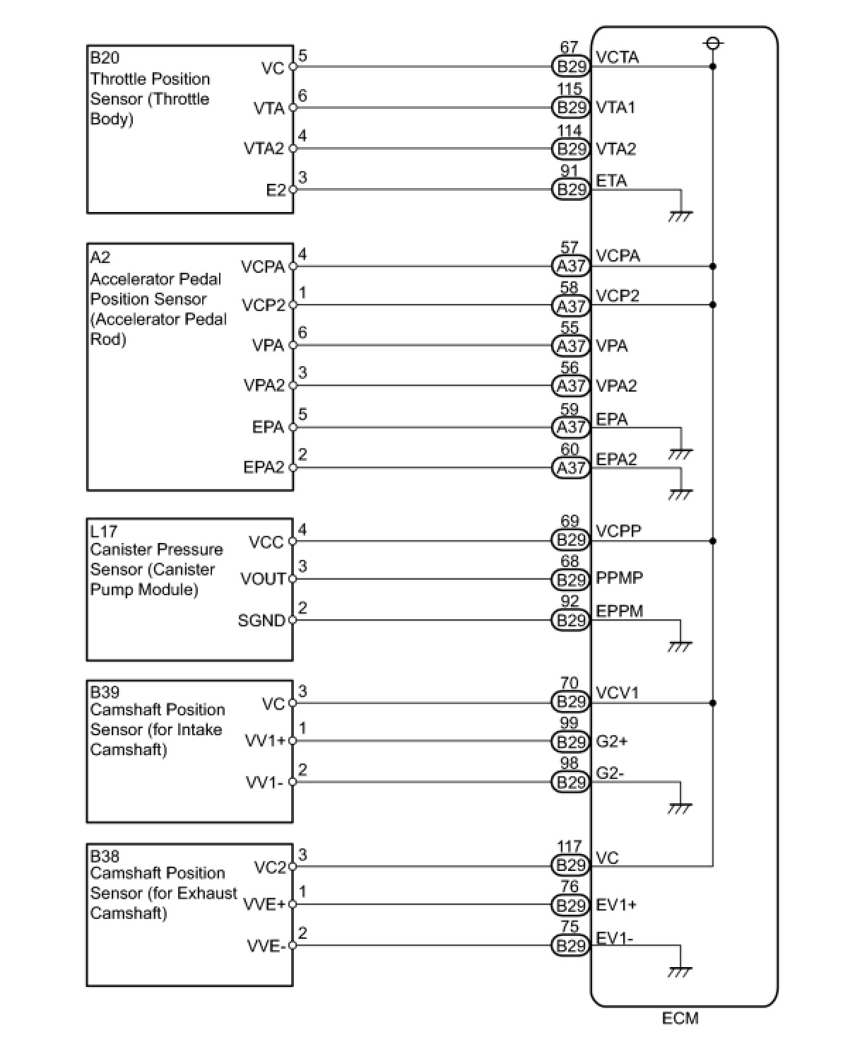 The ECM constantly generates 5 V power from the battery voltage supplied to the +B (BATT) terminal to operate the microprocessor. The ECM also provides this power to the sensors through the VC output circuit.