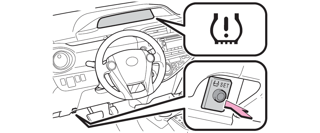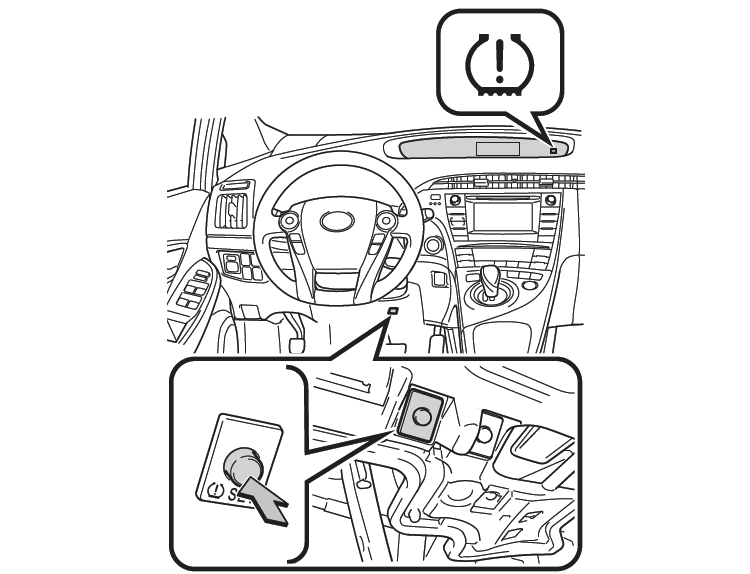 - Press and hold the tire pressure warning reset switch until the tire pressure warning light blinks 3 times at one-second intervals. See Fig 1 or Fig 2 .